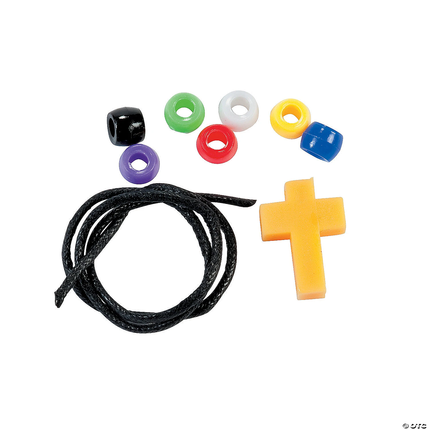 These Beaded Faith Cross Jewelry Craft Kits are ideal Bible crafts for kids whether during Sunday School or vacation Bible school class. Children from the age of pre-school and up enjoy making creations that they can proudly display or wear. They might even be inspired to give their masterpiece to a loved one as a gift. Incorporate the religious crafts as part of a lesson or hand them out as prizes. Each package comes with one dozen kits. Every kit contains a neutral-colored woven nylon cord, a selection of colored beads and a beaded cross. Younger children may need assistance joining the cord ends together. The unbeatable price means teachers can purchase multiple packages for a number of classes. Includes plastic beads and nylon cords. © OTC