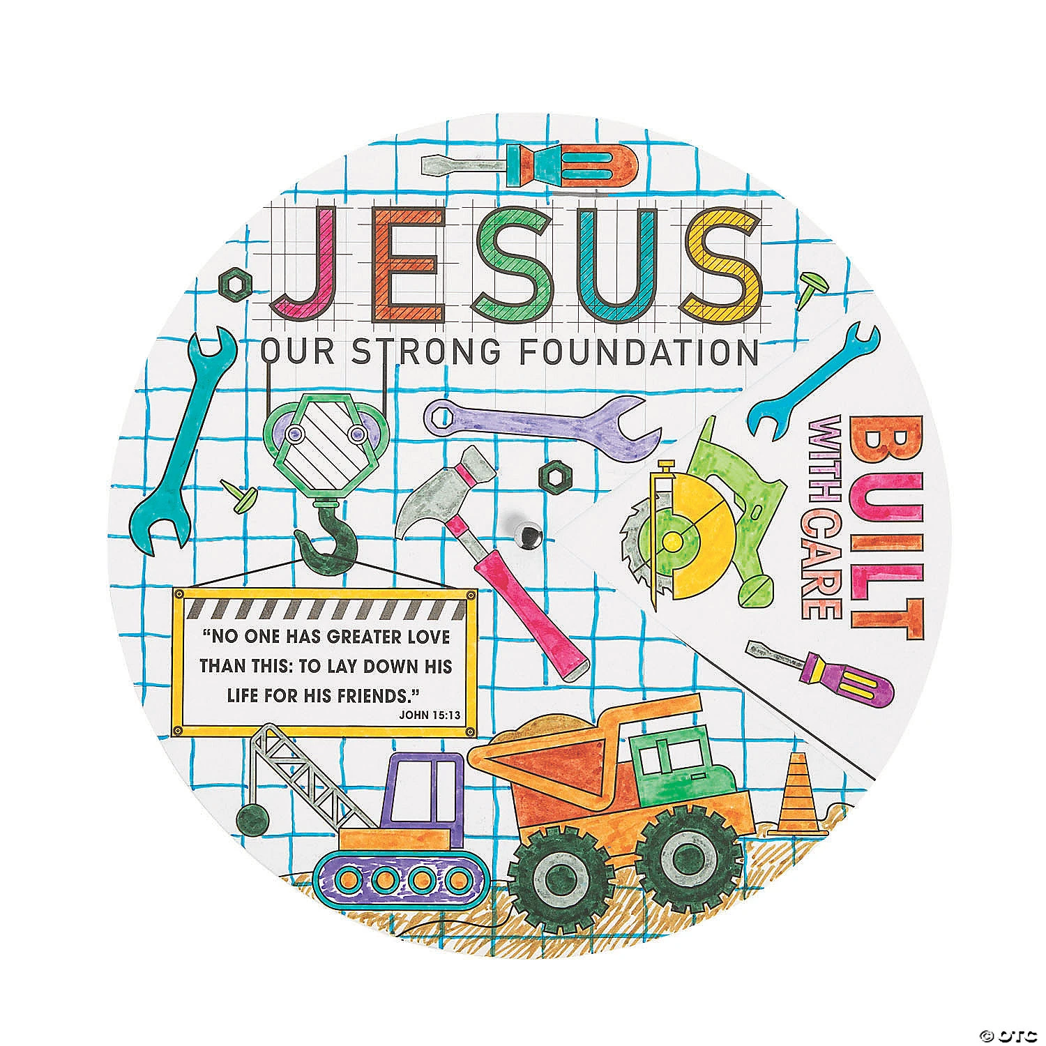 “Drill” in the concepts of Construction VBS with these fun coloring wheels. A great and simple art project for VBS or Sunday School, kids will have fun coloring the wheels before joining the two wheels together for an impressive finished product. Help kids remember that they’re built with care by a God whose love can’t be measured with these exciting projects. Cardstock with metal brad. 9″ diam. © OTC