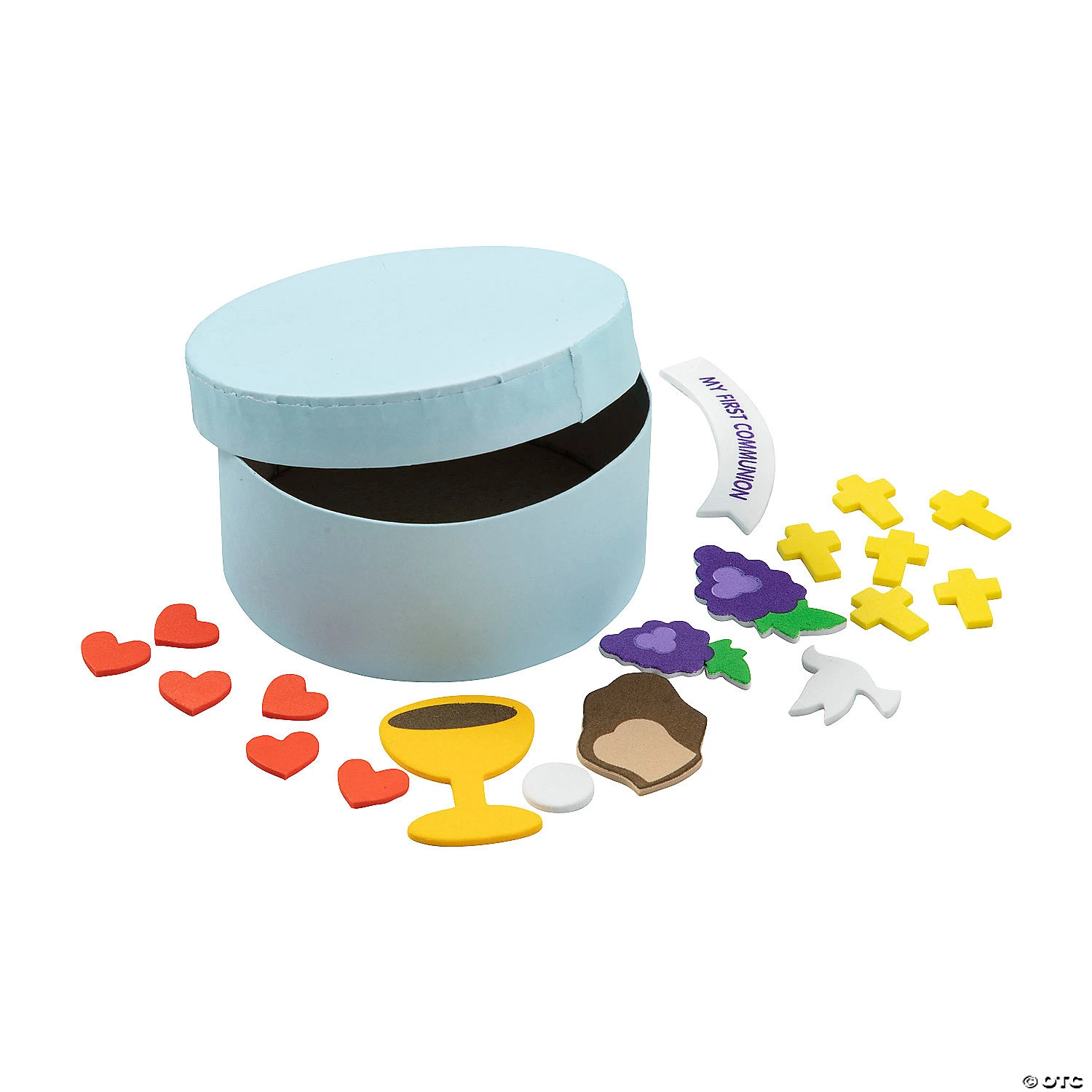 “First Communion” Prayer Box Craft Kit. Where can you put all your hopes and prayers? In your very own cardboard prayer box! This colorful craft lets you design your own cardboard prayer box with colorful self-adhesive foam pieces. A memorable activity for Sunday School, this 3 1/2″ x 1 1/2″ tall prayer box reads, “My First Communion.” All craft kit pieces are pre-packaged for individual use. Kits include instructions and extra pieces. © OTC