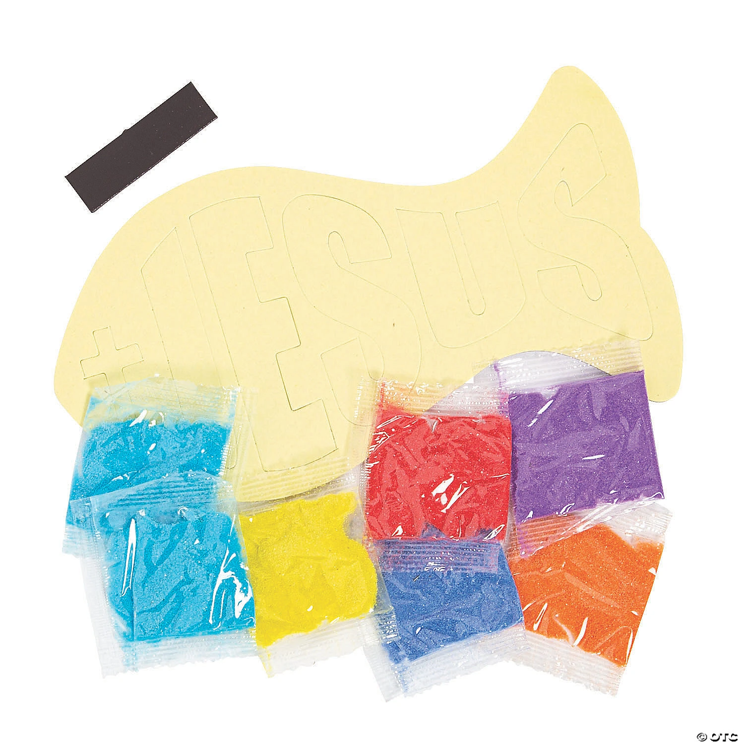 Touch your craft supplies with the power of the Holy Spirit when you include these Jesus Fish Sand Art Magnets. A fun craft for kids to complete while they learn about Jesus, the self-adhesive fish make it easy for the sand to stick. Perfect to include in your Sunday School classroom supplies or art supplies at home, this craft kit will provide hours of creative fun. Includes six assorted packs of colorful sand. Cardboard. 7″ © OTC