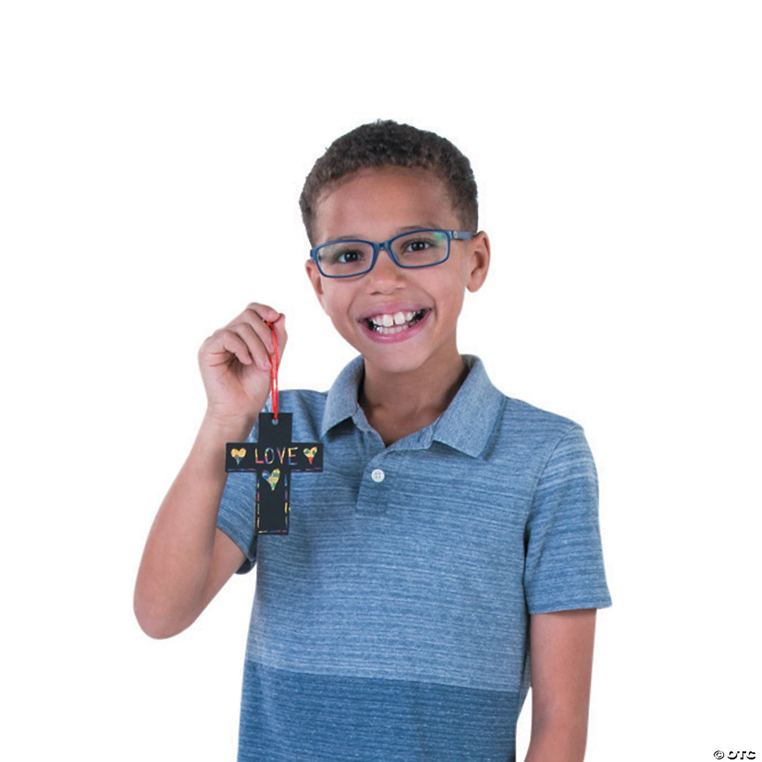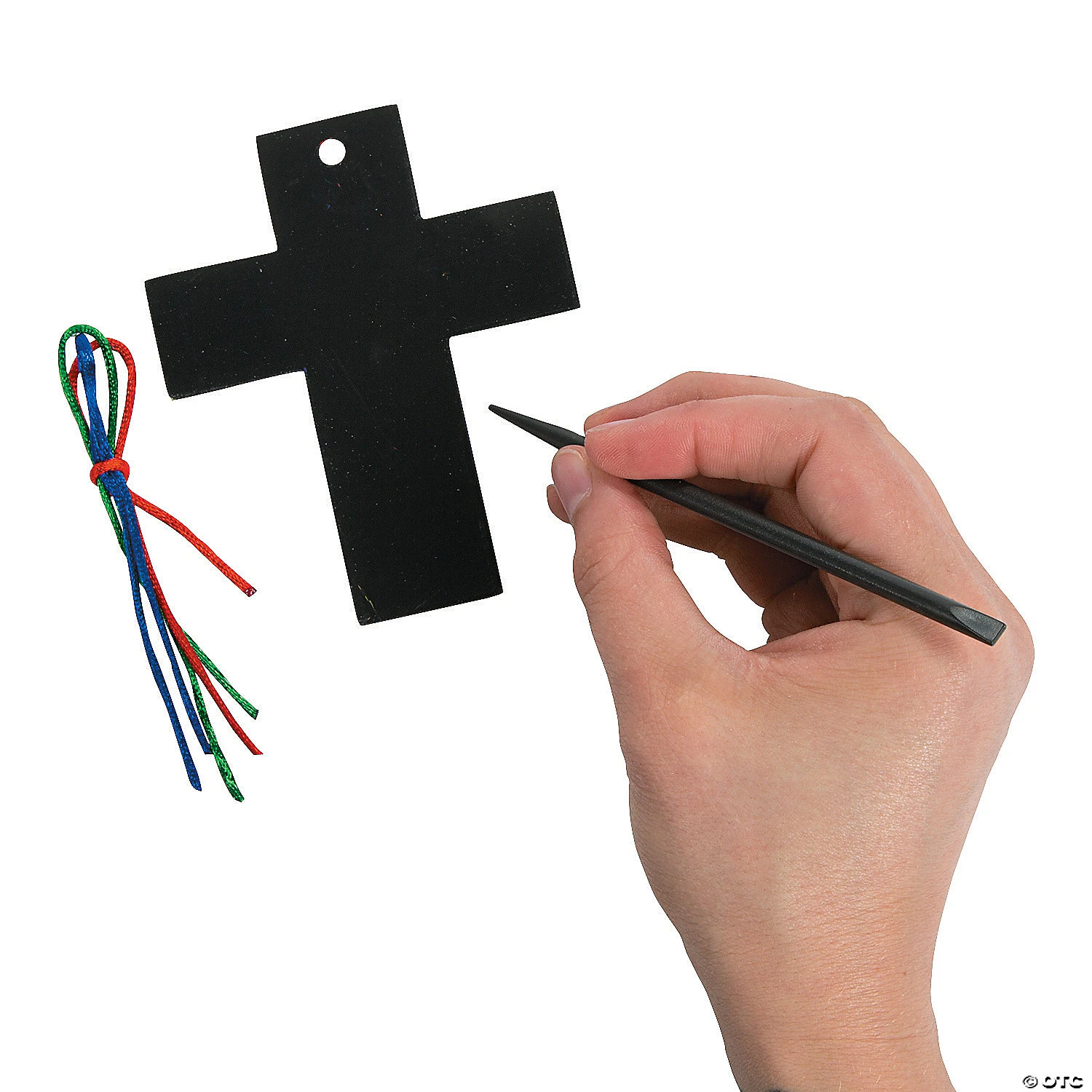 Scratch your own designs on these cross-shaped ornaments. Ideal for Christmas or Easter, this is an easy craft for kids of all ages. Simply use the included scratching tool to remove the black surface and reveal the colorful pattern underneath. See your own designs come to life through these beautiful cross ornaments. Craft projects are an easy rainy-day activity for church groups, Sunday School and day cares. (2 dozen ornaments, 1 dozen scratching tools and 2 dozen satin ribbons per unit) 4 1/4″ © OTC