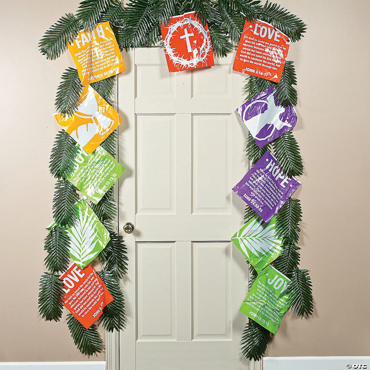 Perfect for Holy Week decorations, use these artificial palm leaves to create a traditional look in your home on Easter. Honor Palm Sunday when you gather multiple leaves in a vase or tie use to decorate your organization’s Easter egg hunt. These elegant and durable silky leaves are a lovely way to decorate for a church holiday dinner or Sunday School event. Polyester. Approx. 7″ x 19″.