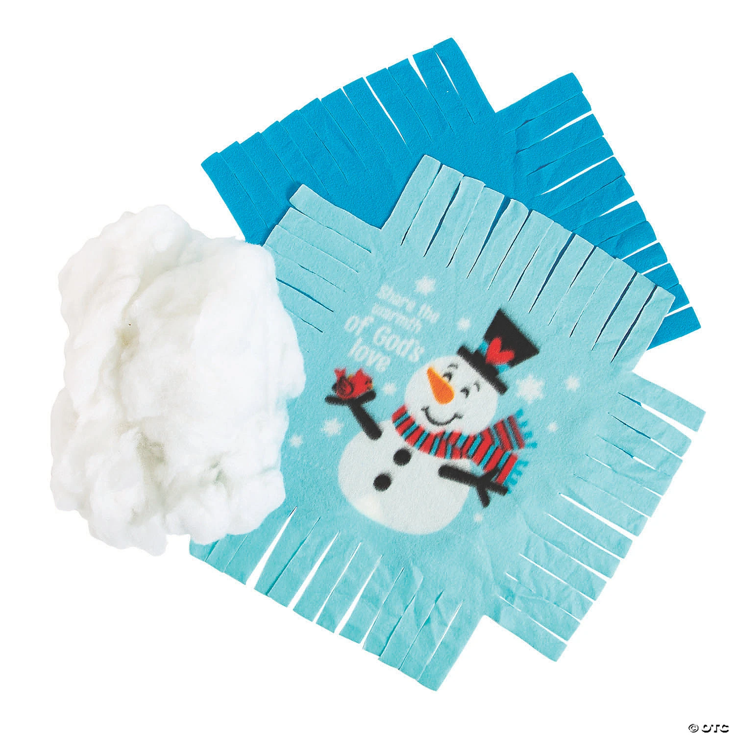 Bye-bye winter blues! This activity will keep kiddos busy during the chilliest season. A fun addition to seasonal religious crafts for kids, these tied pillows are a cinch to create and feature a smiling snowman with text that reads “Share the Warmth of God’s Love”. After making in Sunday School, little ones will love snuggling up to their finished pillow during cold evenings at home! Includes pre-cut fleece fringe and polyester fiberfill stuffing. Unfinished, 16 1/2″. Makes 6. All craft kit pieces are pre-packaged for individual use. Kits include instructions. Imported. © OTCReligious Snowman Fleece Pillow Instructions